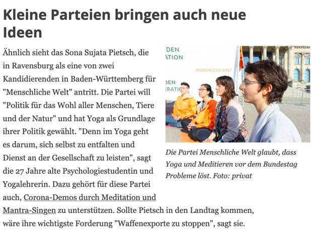 MENSCHLICHE WELT thematisiert Meditation in ihrer Wahlkampagne.
