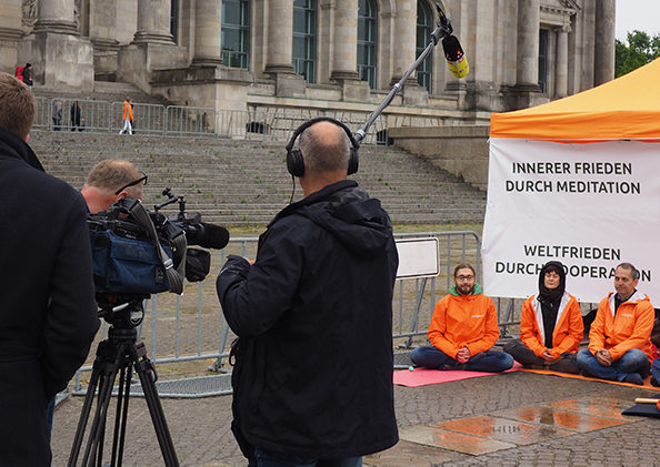 Ein RTL Team besuchte die MENSCHLICHE WELT heute vor dem Bundestag. Es filmte unsere Meditation und führte Interviews mit Dada Madhuvidyananda und Europawahlkandidat Dominik Laur.